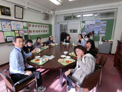 今日の給食献立の「トマトスパゲッティやイタリアンサラダ、ケーキ」を食べながら楽しい時間を過ごしました。