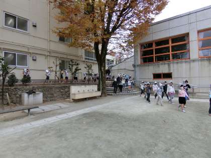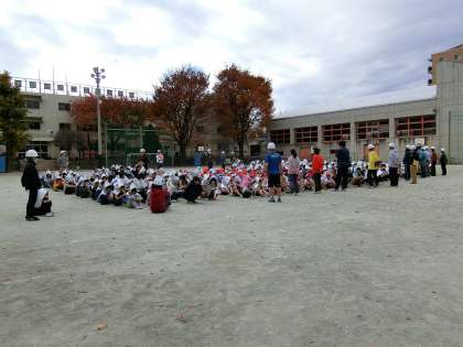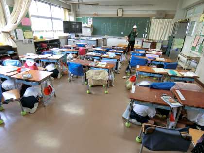 3校時の後半、非常放送が校舎内に伝えられ、身を守る姿勢を確保し、その後の指示で校庭まで「お・か・し・も」の約束を守りながら、静かに全員が避難しました。