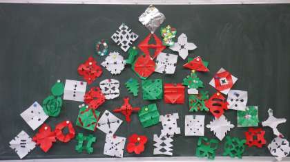 一人ひとりが作ったクリスマスの飾りを、まとめて黒板に貼ったら、すてきなクリスマスツリーになりました!