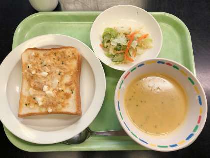 今日は、寒い日にうれしいポタージュスープです。コーンポタージュはそのなかでもよくリクエストされる人気メニューです。コーンの甘みと濃厚なスープで体の中から温まりそうですね。実はこのスープには、コーンだけでなく、じゃがいも、たまねぎ、にんじん、いんげんまめも入っているのです。おいしくて温かいだけでなく、たっぷりの栄養もとれる優秀なスープなので、残さず飲んでください。
