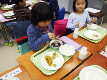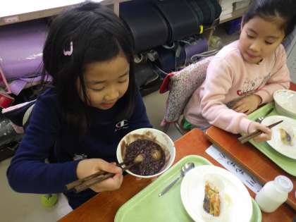 1年生は、はじめて「鏡開き献立」を食べました。