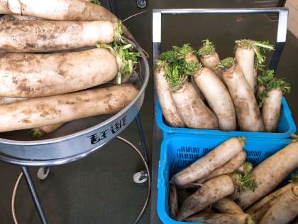 目の教室のお友だちが昨日、桜丘の直井農園でぬいてきてくれた大根を、本日の給食に使用しました。