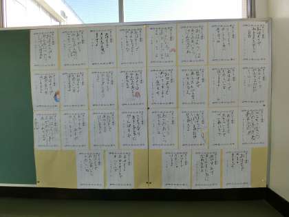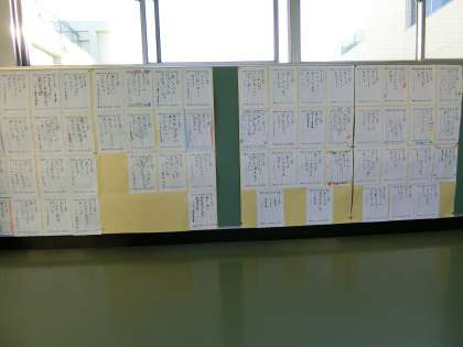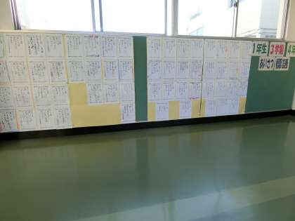 2階渡り廊下の掲示コーナーに、全員が作った「あいさつ標語」が、掲示・発表されています。一人ひとりが、あいさつの素晴らしさや大切さを、5・7・5のリズムでつくり上げています。