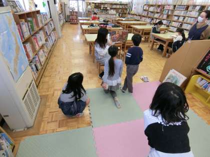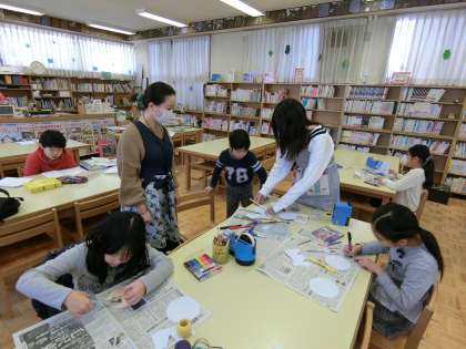 本校の図書館では毎月1回、授業のない土曜日の午前中の時間に「図書館イベント」を開いています。本の読み聞かせ(ミニお話会)と本の紹介、そしてミニ工作を行っています。