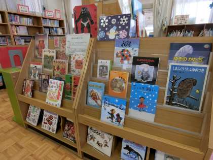 今日の前半は、2人の学校図書館司書さんによる読み聞かせです。今の季節にぴったりの「ゆきの かたち」と「ふくはうち おにもうち」の2冊の本が紹介されました。また、2月3日の「節分」を前に、図書館に設置された本のコーナーについての紹介もありました。
