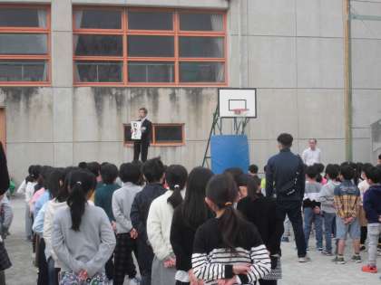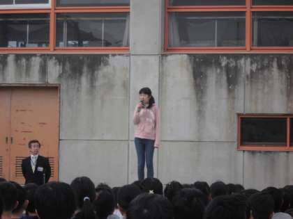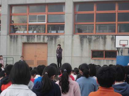 今日は校庭での全校朝会です。校長先生のお話は、先週のあいさつ週間についてのことから始まりました。先週末にあいさつ週間のふりかえりを行いましたが、「自分からすすんであいさつをしていますか。」について72%の子どもたちが「そう思う」26%の子どもたちが「だいたいそう思う」と答え、合わせて98%の子どもたちがすすんであいさつをしたと感じているという結果となりました。その後、校長先生からは、めあてをもつこと、ふりかえることの大切さについてのお話がありました。