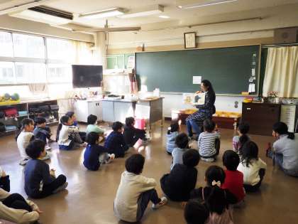 1年生の教室では「おれ、かえる、やめる」というお話と「おでんざむらい」というお話を読んでもらいました。子どもたちは、くすくす笑いながら楽しくお話を聞くことができました!