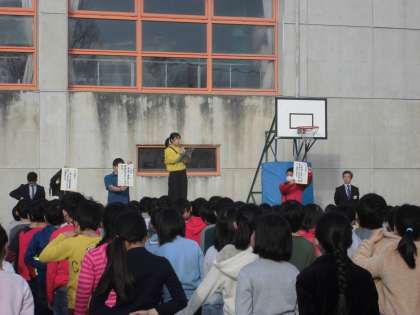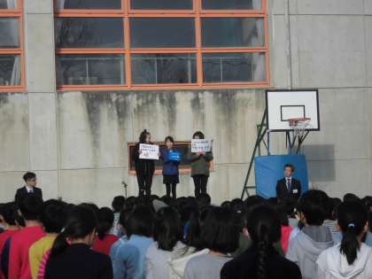 続いて、代表委員会の子どもたちから、2月の19日(火)、20日(水)、22日(金)の3日間行われるユニセフ募金についての連絡がありました。集められた募金がどのように使われるのかについて例を挙げて分かりやすく説明していました。
