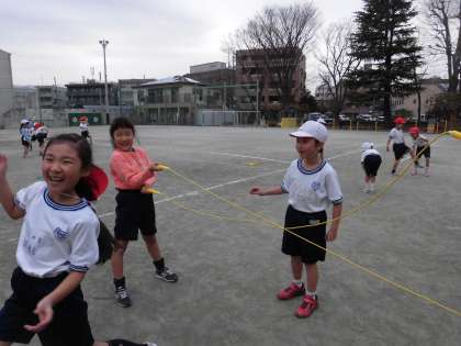 なわとびをつかった遊び「いろはにほへと」と、「ぴょんぴょんリレー」を行いました。