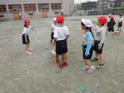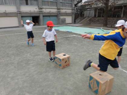 「ぴょんぴょんリレー」では、ケンステップと段ボールを置く場所をグループで話し合って決めました。自分達で何度も試してリズムのよいコースを考えていました。競走の場面では、応援の声が校庭中に響く、楽しい活動になりました。