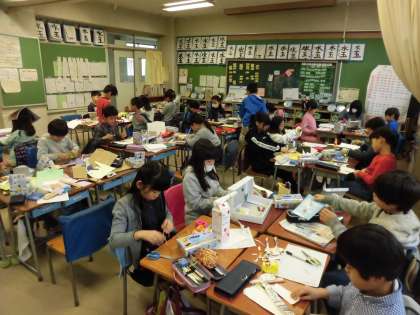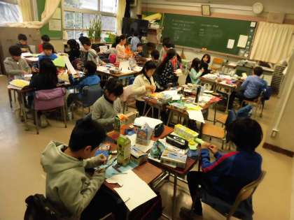 磁石を使って、おもちゃ作りをしました。引きつけ合う力を使うか、退け合う力を使うか、両方使うか、考えながら計画を立てて作りました。しんと静まりかえった教室。みんな真けんな表情で取り組んでいました。