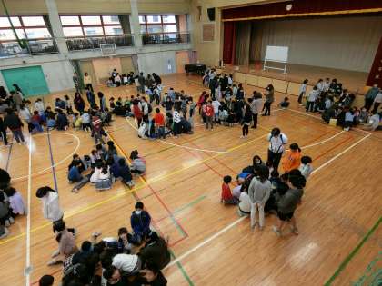 集会委員が発表する言葉をビンゴシートでチェック。当たると歓声が上がり、次々と発表される中、「ビンゴ」となるグループが紹介され、体育館全体がとても盛り上がり、歓声が響き渡る楽しい時間となりました。
