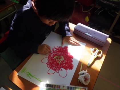 画用紙にクレヨンで大きな花を描き、はさみできれいに切り抜きます。
