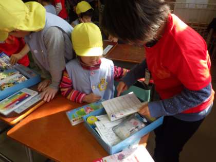園児は授業を見ながら、1年生が使っている勉強道具に興味津々。