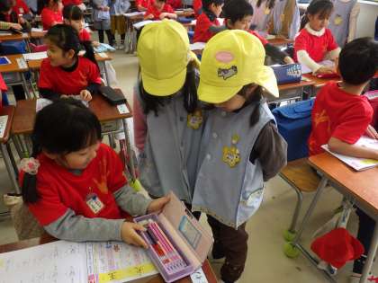 1年生は自分の筆箱を見せてあげたり、道具箱の中身を見せてあげたりしていました。
