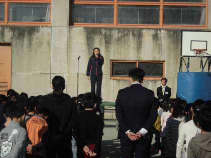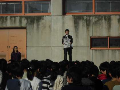 今日の全校朝会の校長先生のお話は、二十四節気の「雨水」についてと、春の天気を表す「三寒四温」についてから始まりました。校庭では梅のつぼみがほころび始め、春の訪れを感じます。また、明日からのユニセフ募金の紹介もありました。