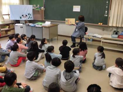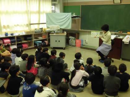 今日は、お話しポケットの皆さんが来て、絵本の読み聞かせをしてくれました。子どもたちは、お話しポケットの皆さんが来るからと、我先に教室の準備をして待っていました。