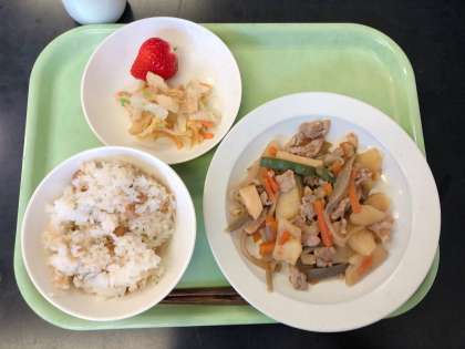 給食は毎日、みなさんがいろいろな食品をとることができるよう考えて作っています。ごはんやパン、肉などは、普段意識しなくてもとりやすいですが、野菜・牛乳・海草・きのこなどは、意識しないと必要な量を食べることは難しいです。今日の給食には、そんな豆や海草、きのこが入っています。苦手な人もがんばってチャレンジしましょう。