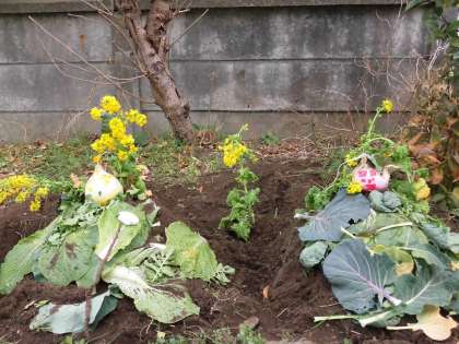 その後で、畑で野菜を使って大きなおひな様を作りました。
