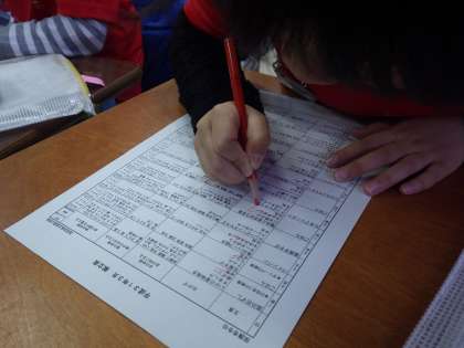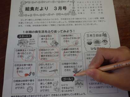 給食が大好きな1年生の子ども達は、今月はどんな給食がでるのか、わくわくしながらこの“おたより”を読んでいます。自分の好きなメニューや食材に赤鉛筆で印をつけるのが毎月の習慣です。