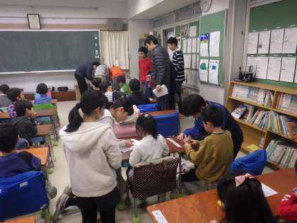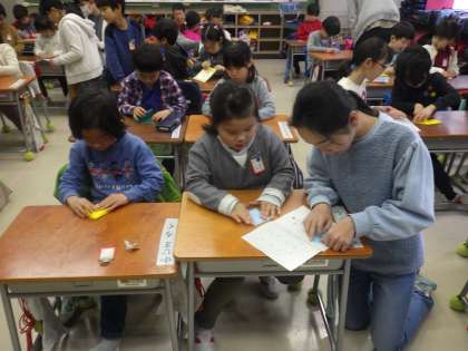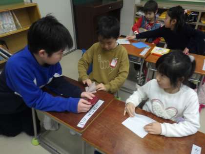6年生から折り鶴の作り方を丁寧に教えてもらい、1年生はうれしそうでした。