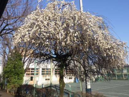 あすは今年度最後の土曜授業日です。本校にお立ち寄りの際には、しだれ梅をひと目ご覧ください。