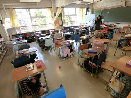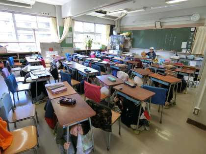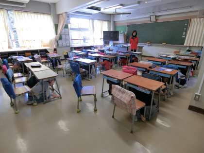 今朝の全校朝会で子どもたちに伝えてあったこともあり、子どもたちは流れてきた防災無線の案内と指示を受け止め、担任の指示で、身の安全を図る行動「DROP! COVER! HOLD ON!]の安全行動1−2−3を、しっかりと取ることができていました。日頃の避難訓練と避難行動の成果が表れていました。