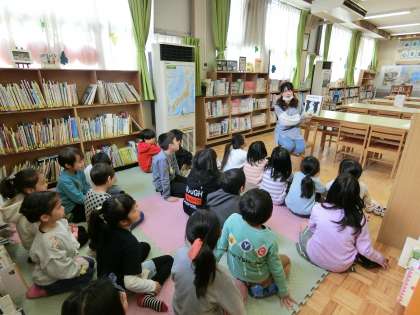 今日の読み聞かせの本は「はるにあえたよ」です。まだ外に出たことのないふたごのこぐま、マークとマータが待ちきれなくて春を探しに出かけるお話です。少し長いお話でしたが、みんな静かに聞き入っていました。