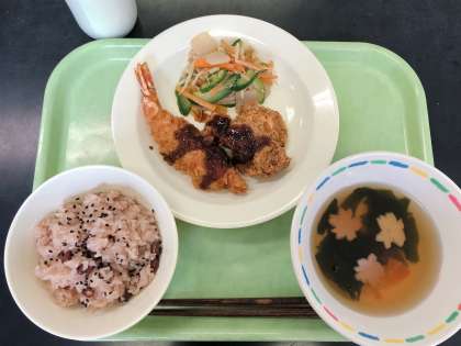 今日は、6年生卒業おめでとう給食です。日本では、お祝いやめでたいときに赤飯を食べる習慣があります。赤飯は赤っぽい色をしていますが、昔から赤い色には邪気を払う力があると考えられていました。そこで、赤飯を食べて縁起を担ごうとしたのです。今日は少し豪華に、ヒレカツやえびフライもつけました。6年生の卒業まで、あとわずかですね。6年間の思い出を振り返りながら、給食も味わって食べてください。