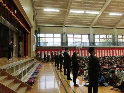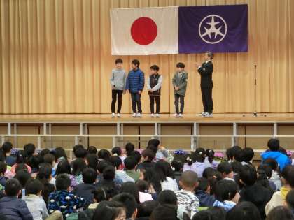 校長先生のお話、6年生代表の言葉や、転入児童の紹介などがありました。