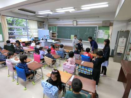 1年生の教室では、6年生が張り切って1年生のお世話を行っています。