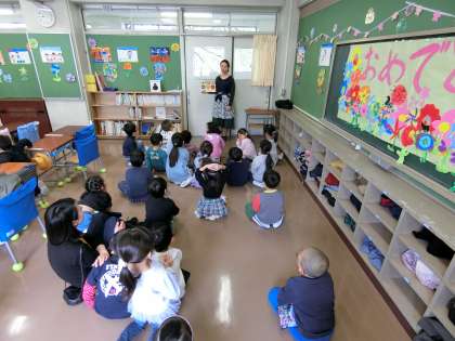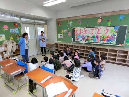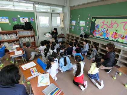 その1つに読み聞かせボランティア「お話しポケット」のみなさんや学校図書館司書による「手遊び」と「読み聞かせ」があります。入学式の翌日の9日(火)から、8時45分から9時頃までの時間帯に、3学級で読み聞かせを行っています。