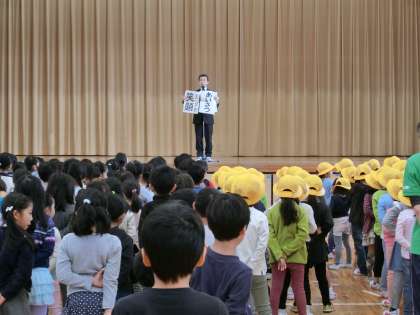 1年生もしっかりと話を聴き、返事もしていました。また、2年生以上の子どもたちの姿勢や話の聞き方も立派で感心しました。子どもたちのよさを感じた全校朝会になりました。