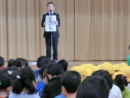 校長からは、「笑顔がいっぱいの笹原小学校をつくっていきましょう」「一人ひとりが輝く学校をつくっていきましょう」の話をしました。そのための第1歩として「あいさつ」と「ともだち」の2つを全校で大切にしていきましょう、と伝えました。