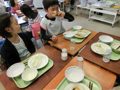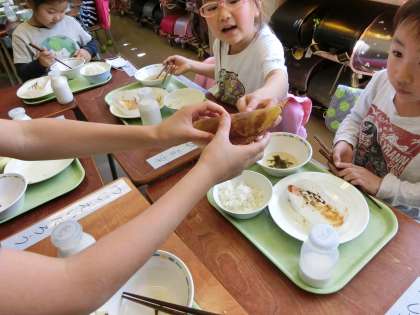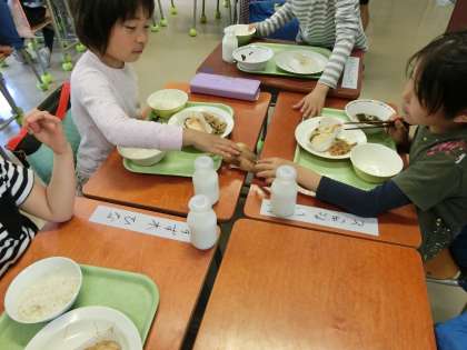 給食の時間に栄養士がそのたけのこの皮を子ども達に見せてまわると、とても興味津々で触ったりにおいをかいだりしていました。「今日のたけのこはいつものたけのことは違うんだよ。とても新鮮でおいしいし、調理員さんが一生懸命作ってくれたから、味わって食べてね。」と伝えると、「だから今日のたけのこはとってもおいしいんだ!」と言ってきれいに完食してくれていました。たけのこが苦手な子も、挑戦してくれたようです。