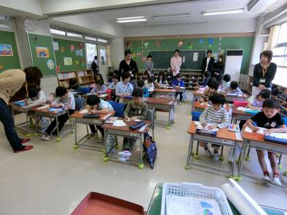 小学校生活で初めての授業参観日となった1年生。お家の方々が来てくださるので、朝から張り切っていました。でも、たくさんの方々が教室の後方に来ていたので、緊張感もたくさん見受けられました。