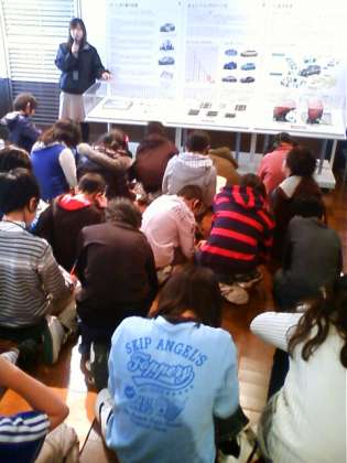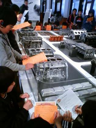 真ん中の写真は、日産横浜工場でクラスごとに話を聞いているところです。右の写真は、一人1台イヤホンを付けて学習しているところです。