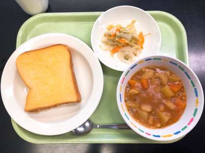 今日は人気メニューのフレンチトーストです。フレンチトーストは、たまご・さとう・牛乳を混ぜ合わせて、バニラの香りをつけたものにパンをひたして焼きます。この「たまご・さとう・牛乳・バニラ」はいろいろなおやつの材料になります。たまごの量を多くして蒸せばプリンに、小麦粉をいれて鍋で火を通せばカスタードクリームに変身します。ほかにはどのようなおやつに変身するでしょうか?