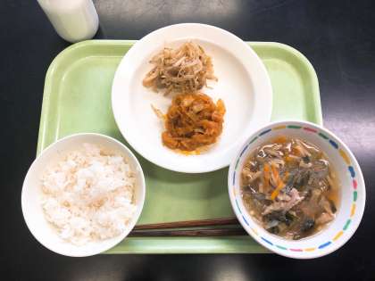 いかのチリソースは、ピリ辛味の中華風のおかずです。しょうがやねぎ、にんにくなどの野菜をみじん切りにして炒めたり、いかに下味をつけて揚げたりと、シンプルに見えてさまざまな手間がかかっています。春雨スープは、つるつると食べやすいスープです。連休明けで疲れが出ているかもしれませんが、給食をしっかりと食べて、元気いっぱい学校生活を送りましょう。