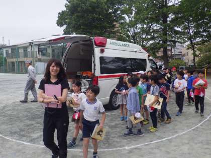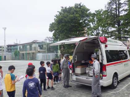 低学年の消防写生会が終わったタイミングを見計らって、消防署の方々が4年生のために救急車や消防車の中を見せてくれました。
