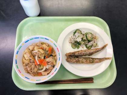 給食の人気メニューのカレーとうどん、その2つが組み合わさったカレーうどんは、笹原小学校だけでなく、日本中で人気のメニューなのではないでしょうか。ししゃもの新緑揚げは、この時期のきれいな新緑をイメージした料理です。新緑とは、4月から5月ころの、若葉のみずみずしい緑色のことです。笹原小にはたくさんの木々があり、学校中に新緑が輝いています。キラキラとした新緑をみると、すがすがしい気持ちになりますね。