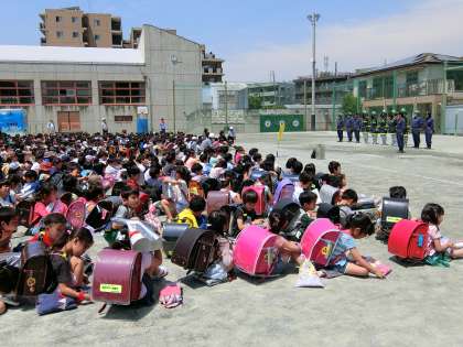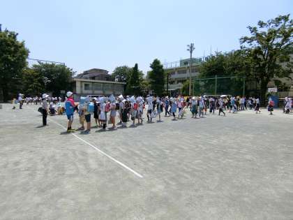第1次避難場所である校庭に安全を確保して避難し、人員確認を行いました。避難が完了し、校長から引き取り訓練の目的について、子どもたちと引き取り人(保護者等)のそれぞれ向けに話をしました。