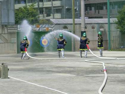 また、地元消防団による放水訓練のデモンストレーションを見学しました。迫力のある放水に感動しました。参観された保護者の皆様からは、大きな拍手が送られました。