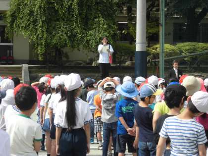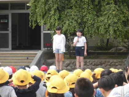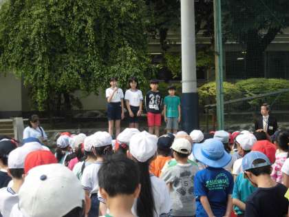 続いて、6年生による笹の子スピーチです。今日は、「なぜ空は青く見えるのか」と「アイスクリームについて」でした。空の色が青く見える理由から海の色が青い理由との違いまで調べることを広げたり、アイスクリームの伝わった土地から気温と売れ行きの関係を話すだけでなく、先日算数ドリルの配布式にいらしたアスリートの現在の仕事がアイスクリーム屋であることなど自分たちとのかかわりまで伝えたりと、内容の濃いスピーチでした。
