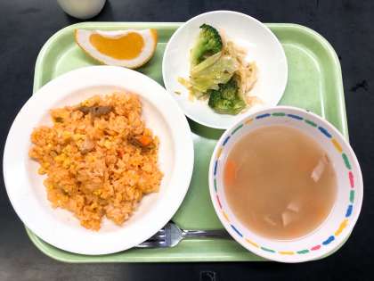 今日から運動会特別時間割が始まりました。運動会までの2週間、給食では今年度新しく笹原小学校にきた先生方の、思い出に残っている運動会のお弁当を出します。今日は6年2組境野先生の思い出のお弁当です。境野先生はチキンライスにうす焼き卵がのっている、オムライスのようなお弁当を食べて運動会をがんばっていたそうです。