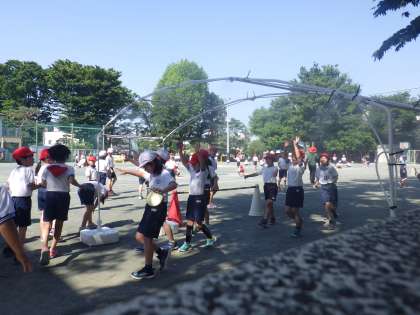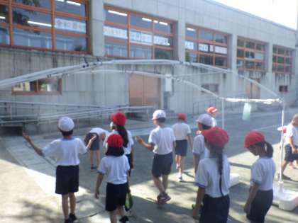 熱中症対策の一環として、今年度笹原小学校では簡易型のミストシャワーを設置しました。