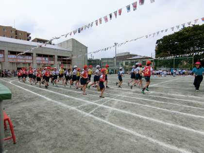 学級からの代表による低学年リレーが午前の部の最後に、また、高学年リレーが午後の部の5・6年団体演技の後に行われました。低学年は一人が半周を、高学年は一人が一周を走り、バトンをつなぎました。