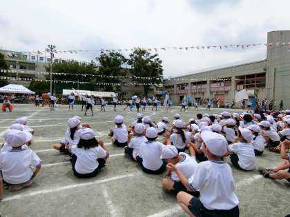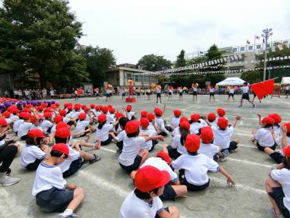 児童席の前で、赤組・白組に分かれて応援合戦を繰り広げました。ウェーブも行い、とても盛り上がり、いよいよ午後の部のプログラムが進行します。