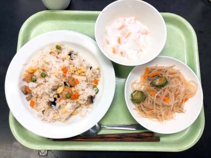 みなさん、運動会お疲れ様でした。ひとりひとりが輝いていてとてもよい運動会でしたね。今日から6月の給食が始まります。6月は「食育月間」といって、「食」に関する知識や健康に生きていくための食事のとりかたを積極的に学んだり、身に付けたりする期間です。運動会もおわり、久しぶりにゆっくりと落ち着いて給食を食べられるのではないでしょうか?よい姿勢でいすにすわり、しっかりと噛んで、野菜の甘みや海鮮のうまみ、春雨の食感やごま油の香りなどを感じて食べましょう。