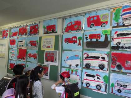 2年生の廊下には、消防写生会で描いた絵が飾られています。